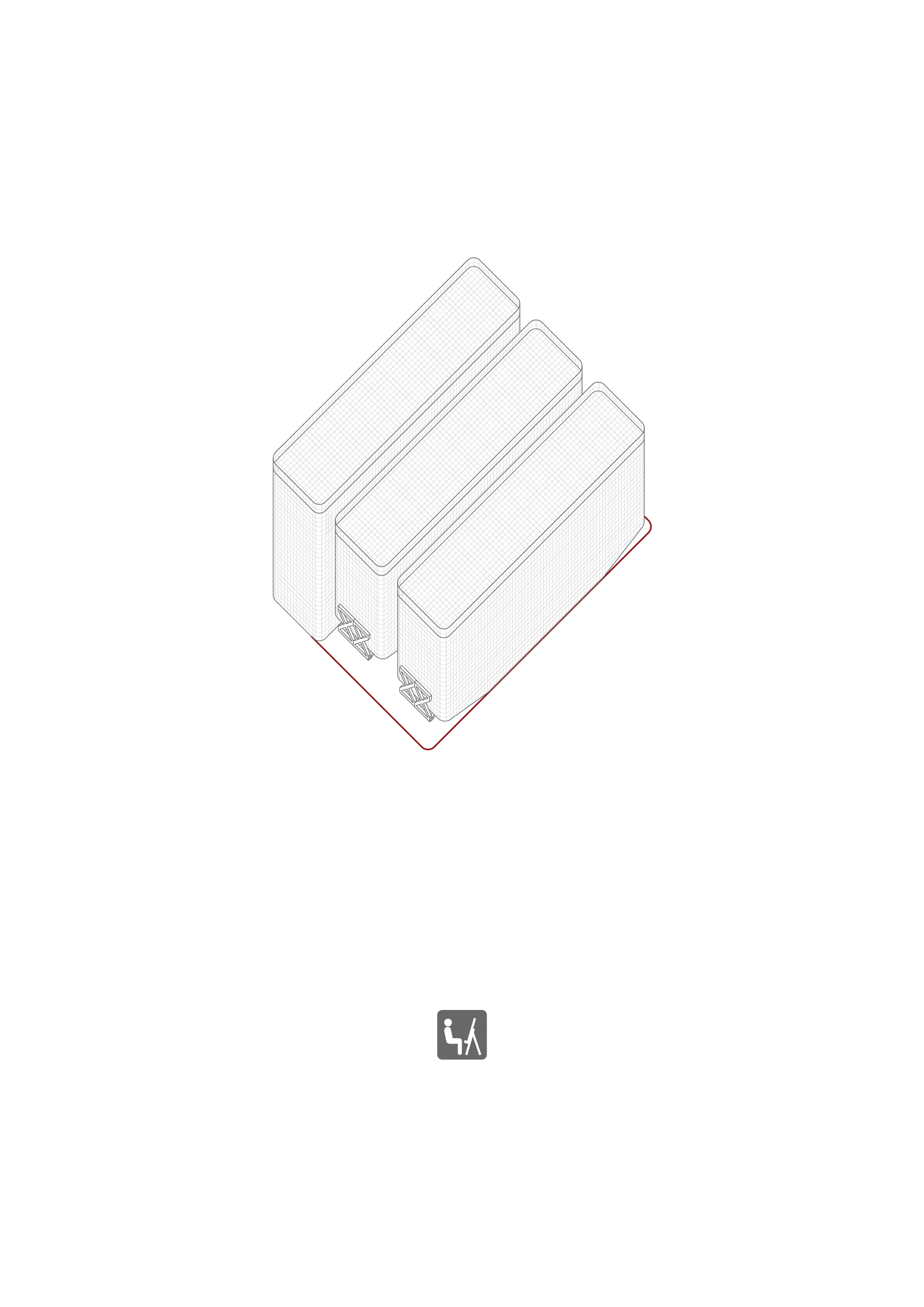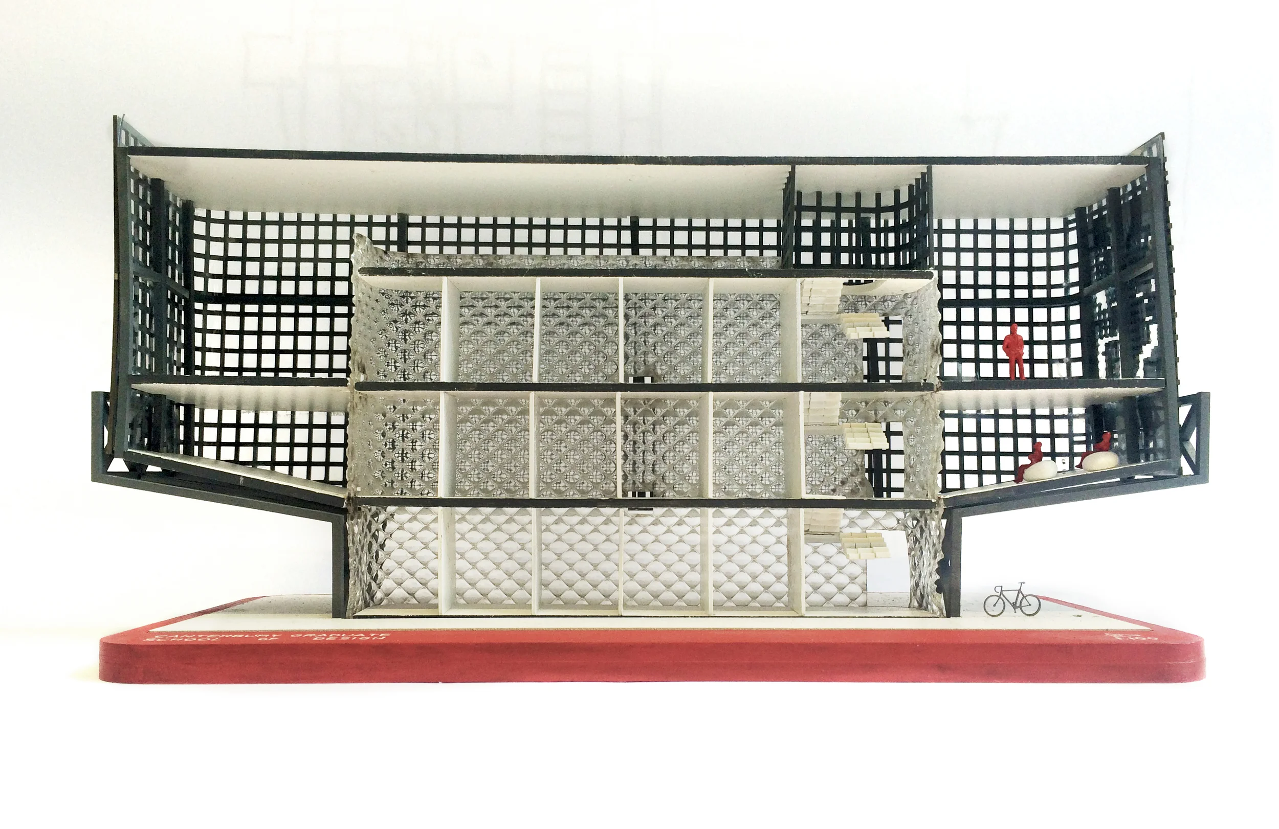 Studios: Three large blocks create the students studio spaces, which also contain the faculty offices. A mesh building envelope features a subtle transparency when sitting against the stone heritage building on site, though doesn’t attempt to blend with the gothic building. Instead manifesting its own industrial gothic support structure which elbows the tapered floors of the studios.