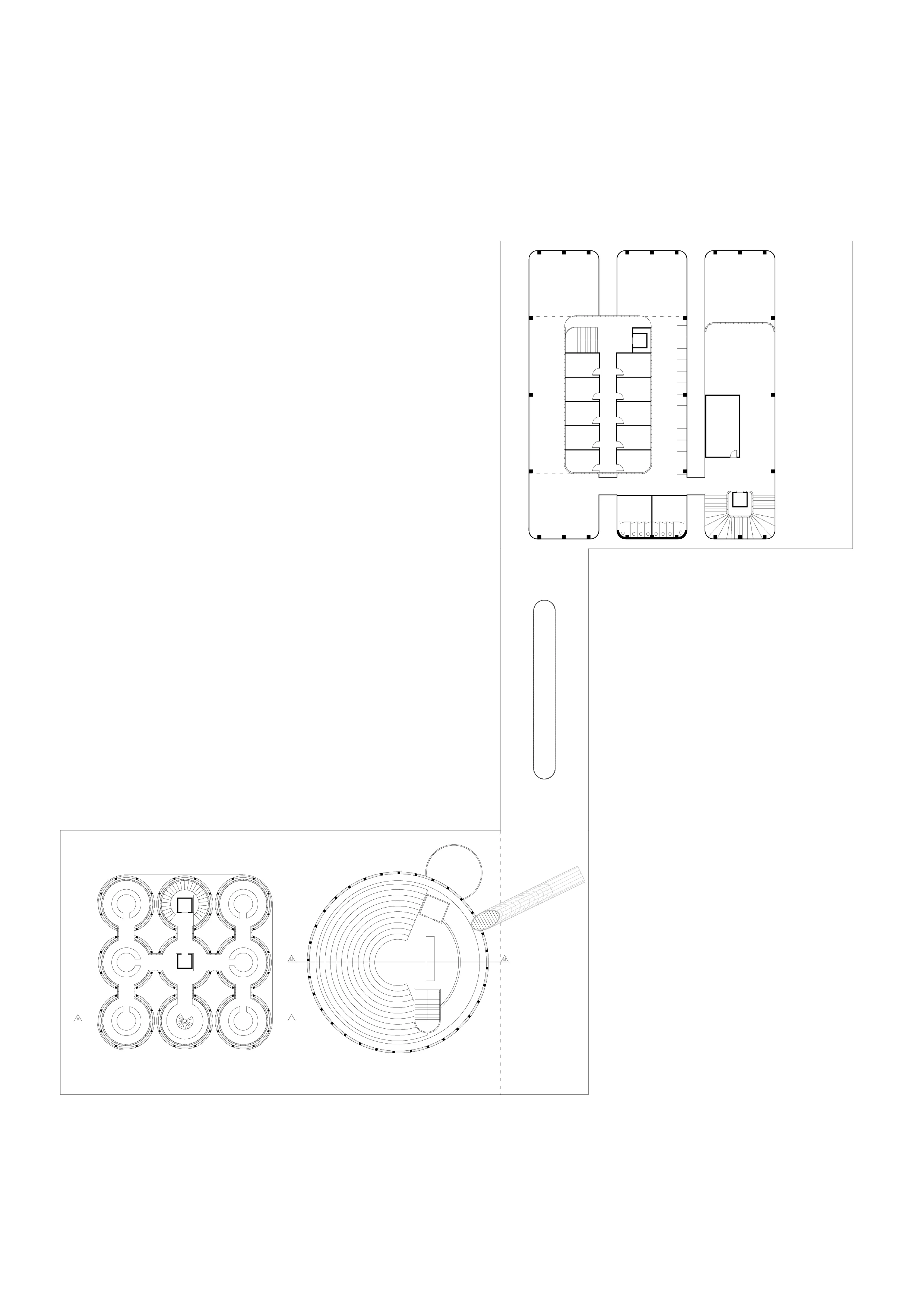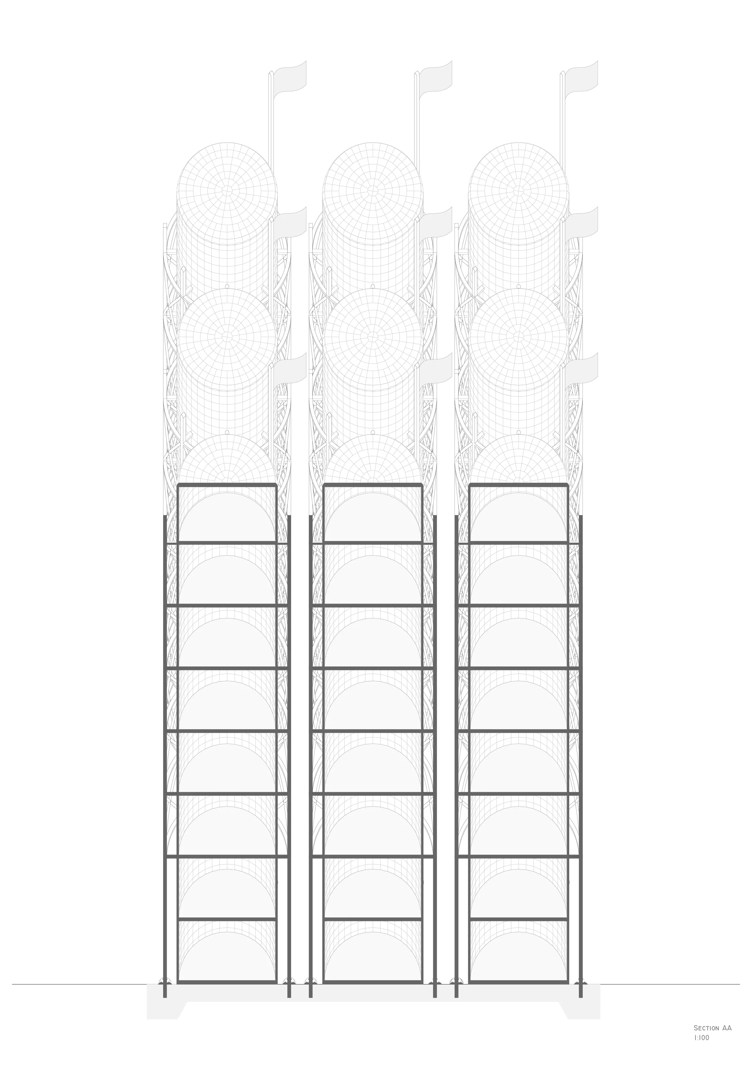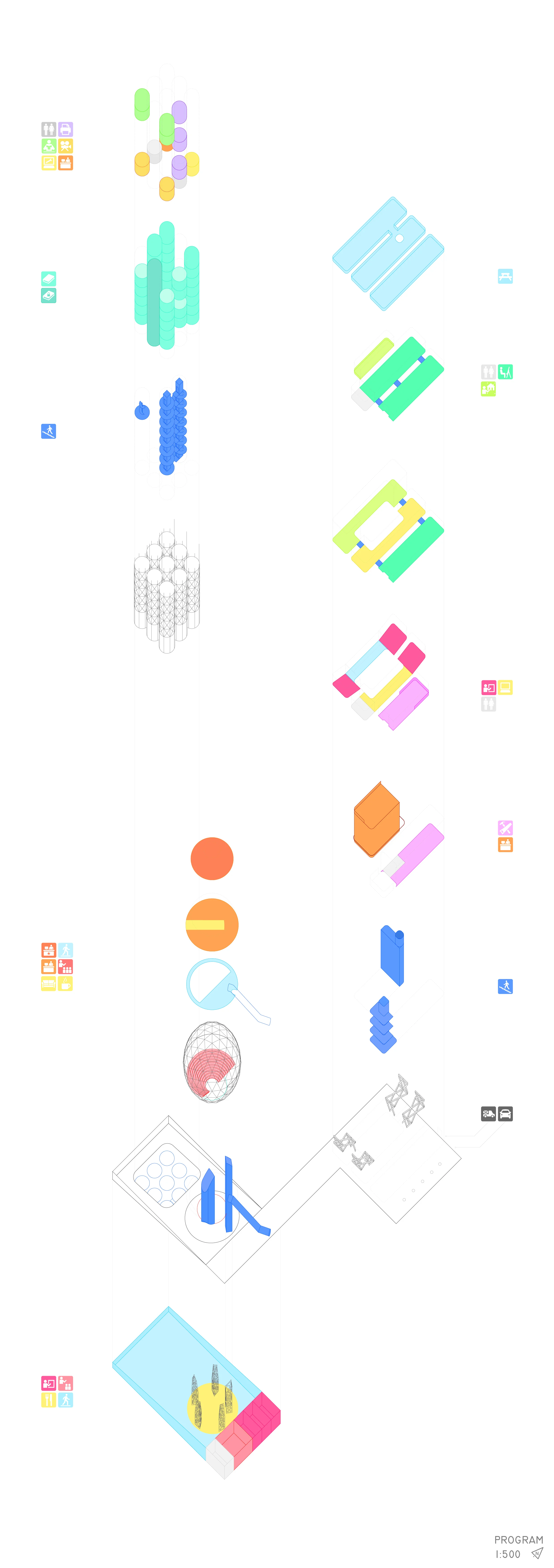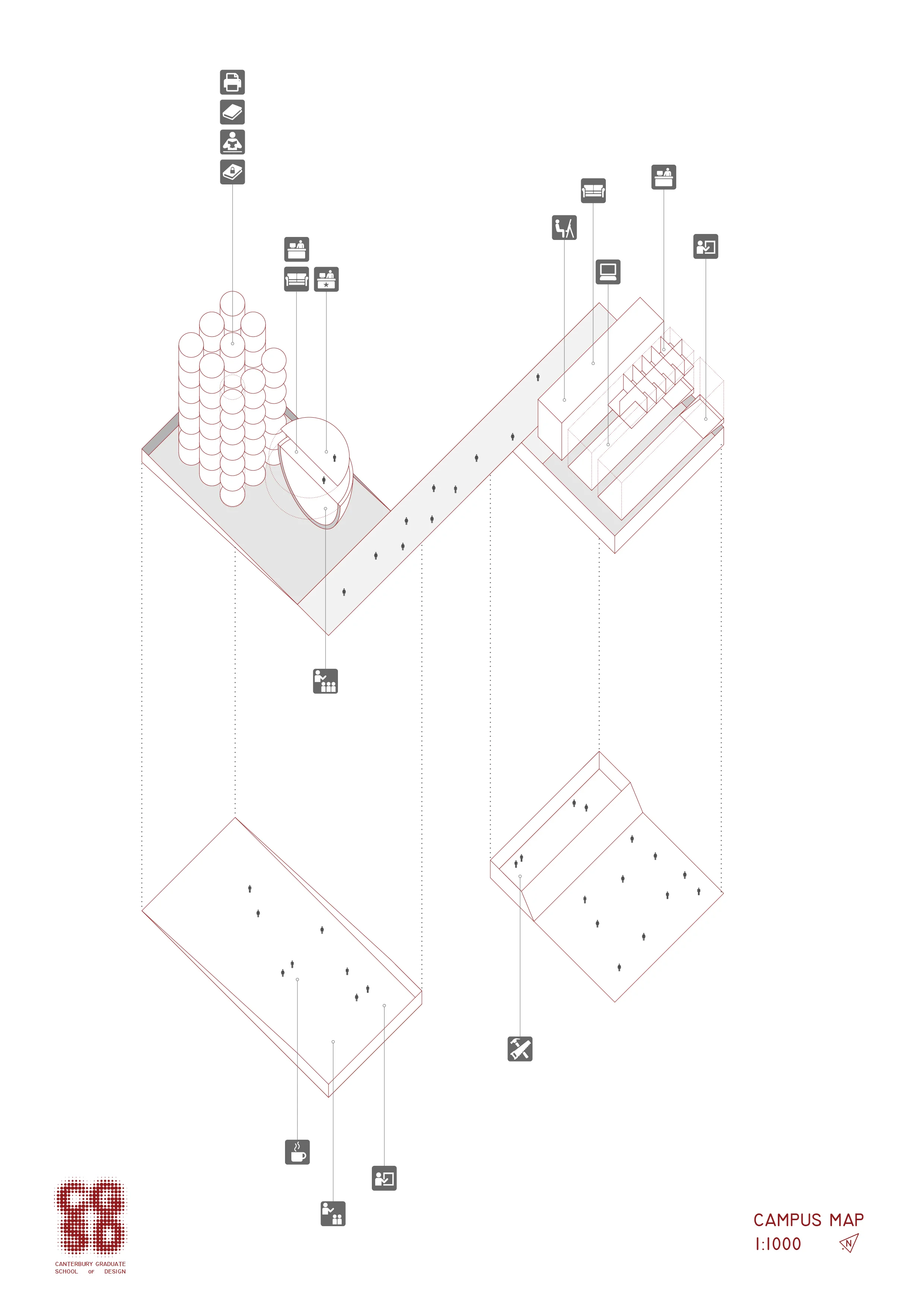 By using elevated, constructivist container forms CGSD allows a pedestrian flow between the existing buildings and the proposed school. The design compromises of three distinct elevated elements. The Silos, the Sphere and the Studios.
