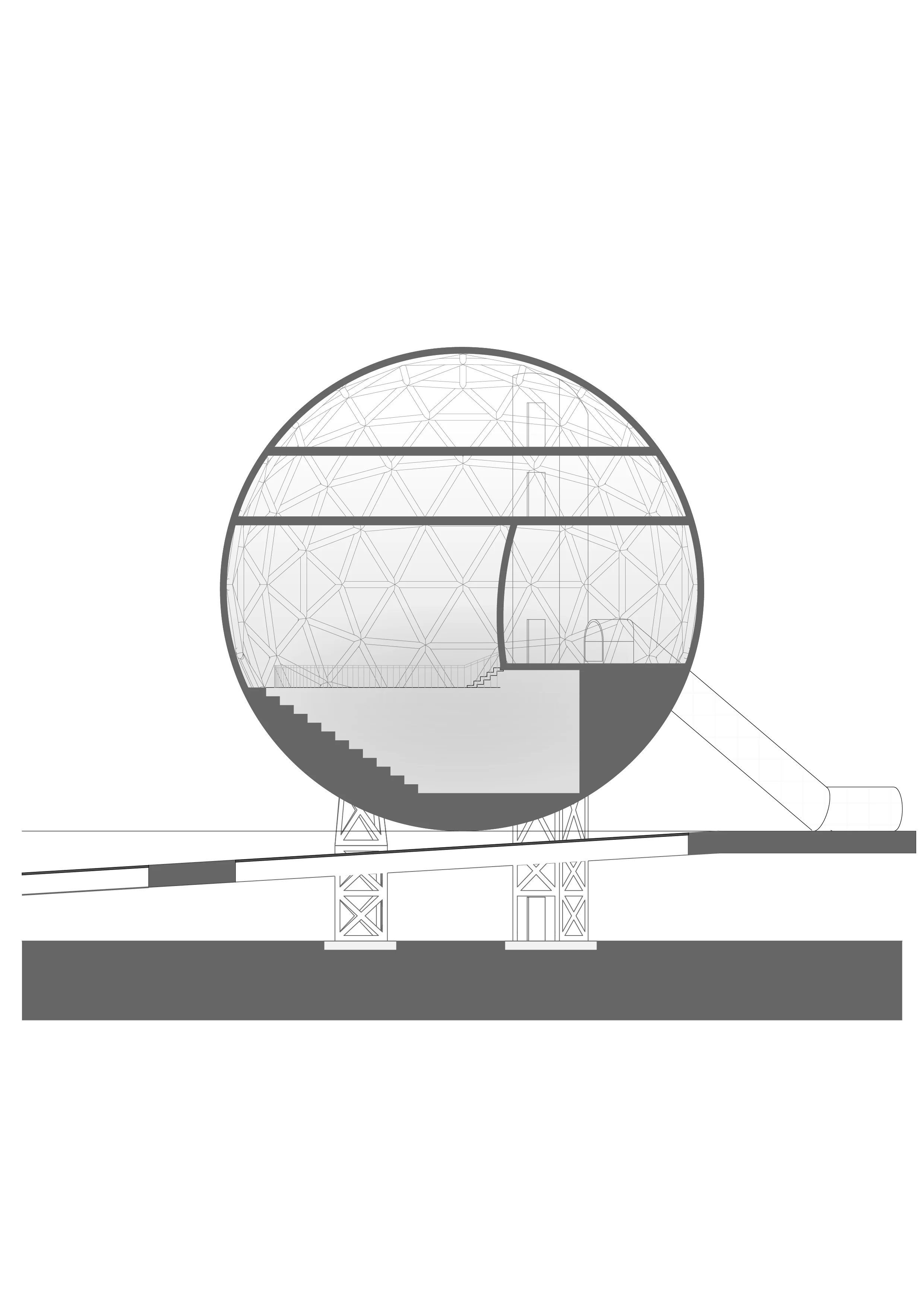 Sphere: A public lecture theatre and debate chamber extends the private program of the university lecture theatre to allow a civic use when class is not in session. For the arts centre a space for performance and presentation is key; as well as a space for architectural debate in the city of Christchurch. The engineered structure is designed based on a steel geodesic sphere, supported by 5 steel stilts and clad in steel sheet metal. The sphere is accessed by elevator, or escalator.