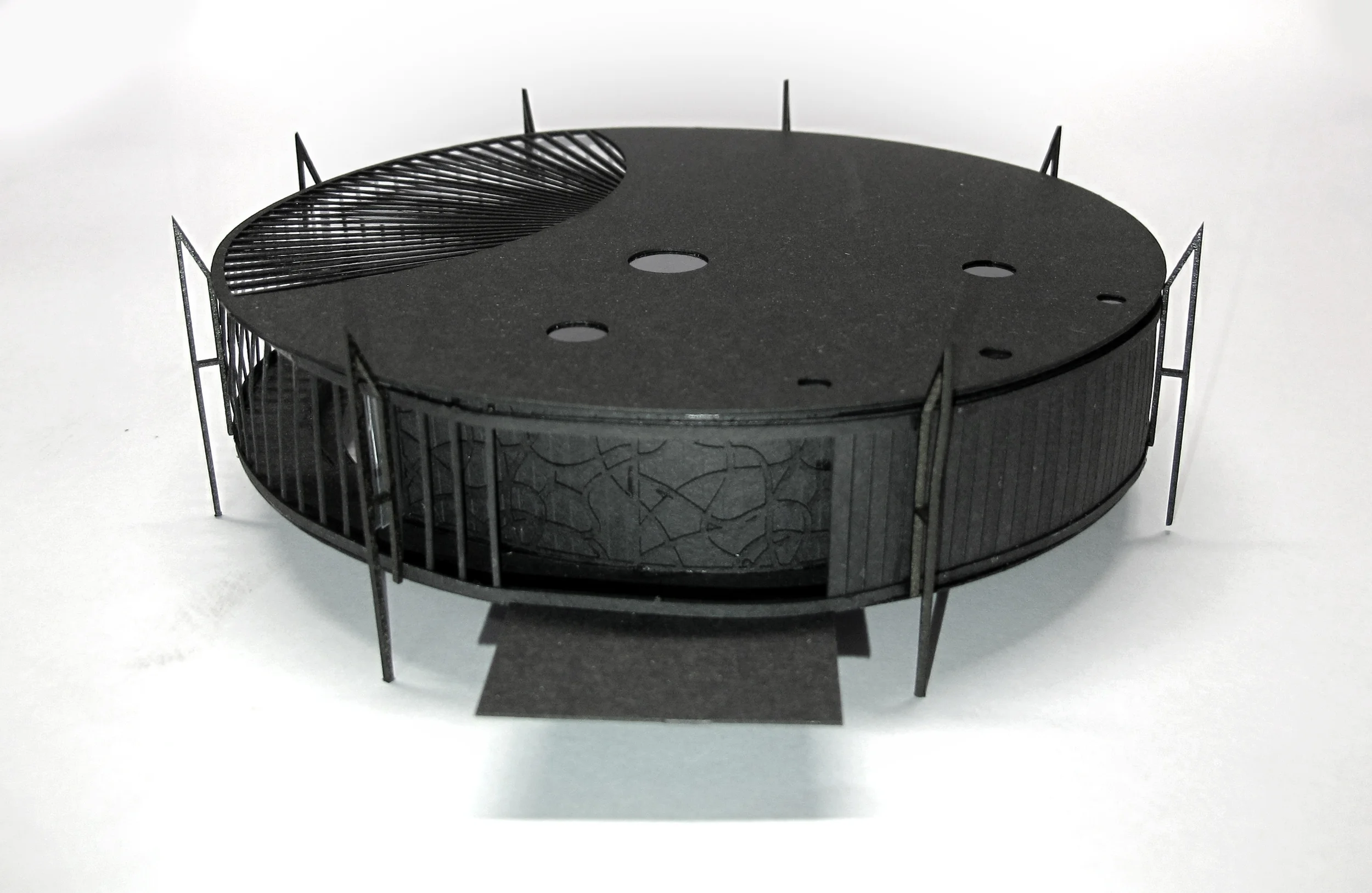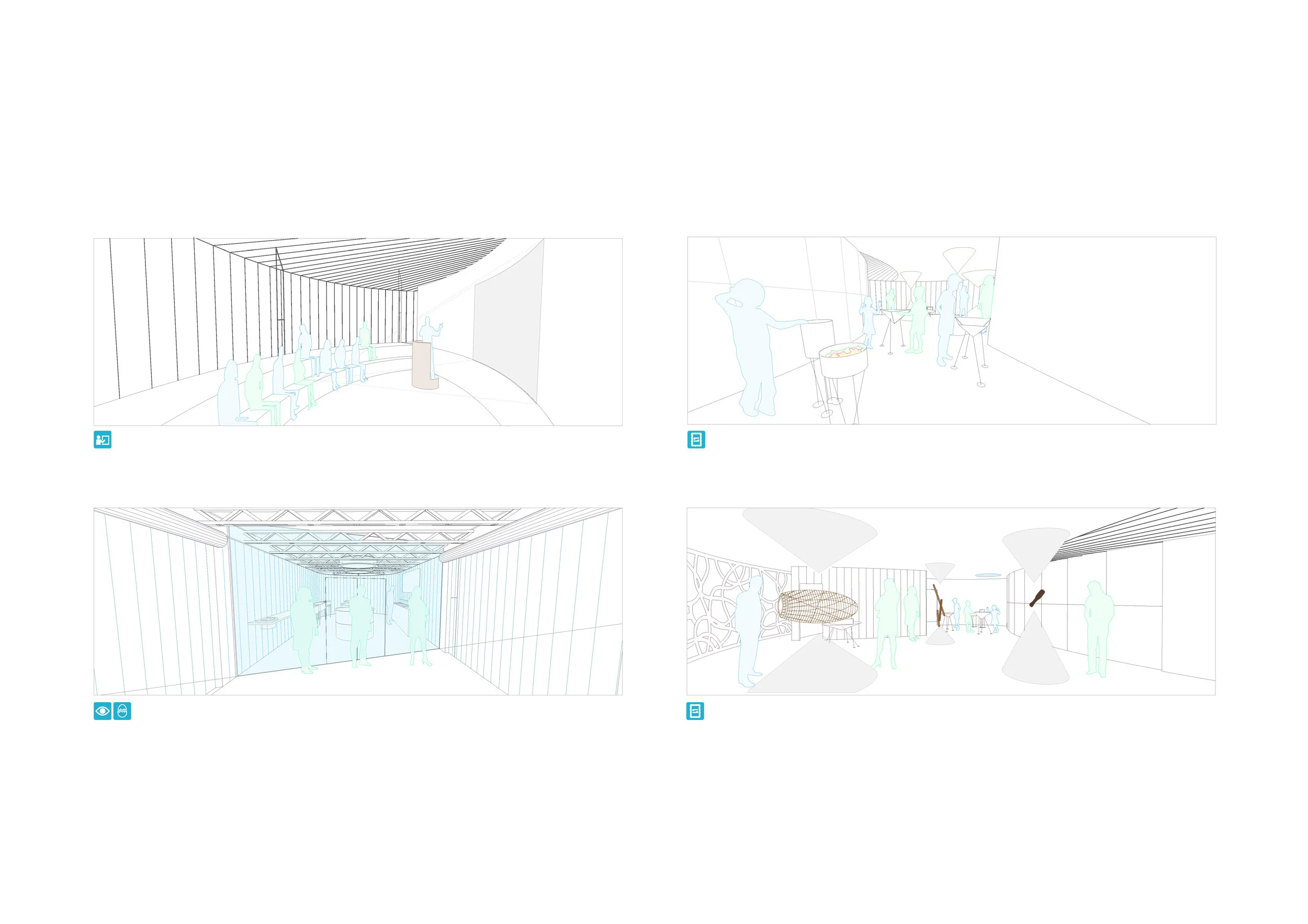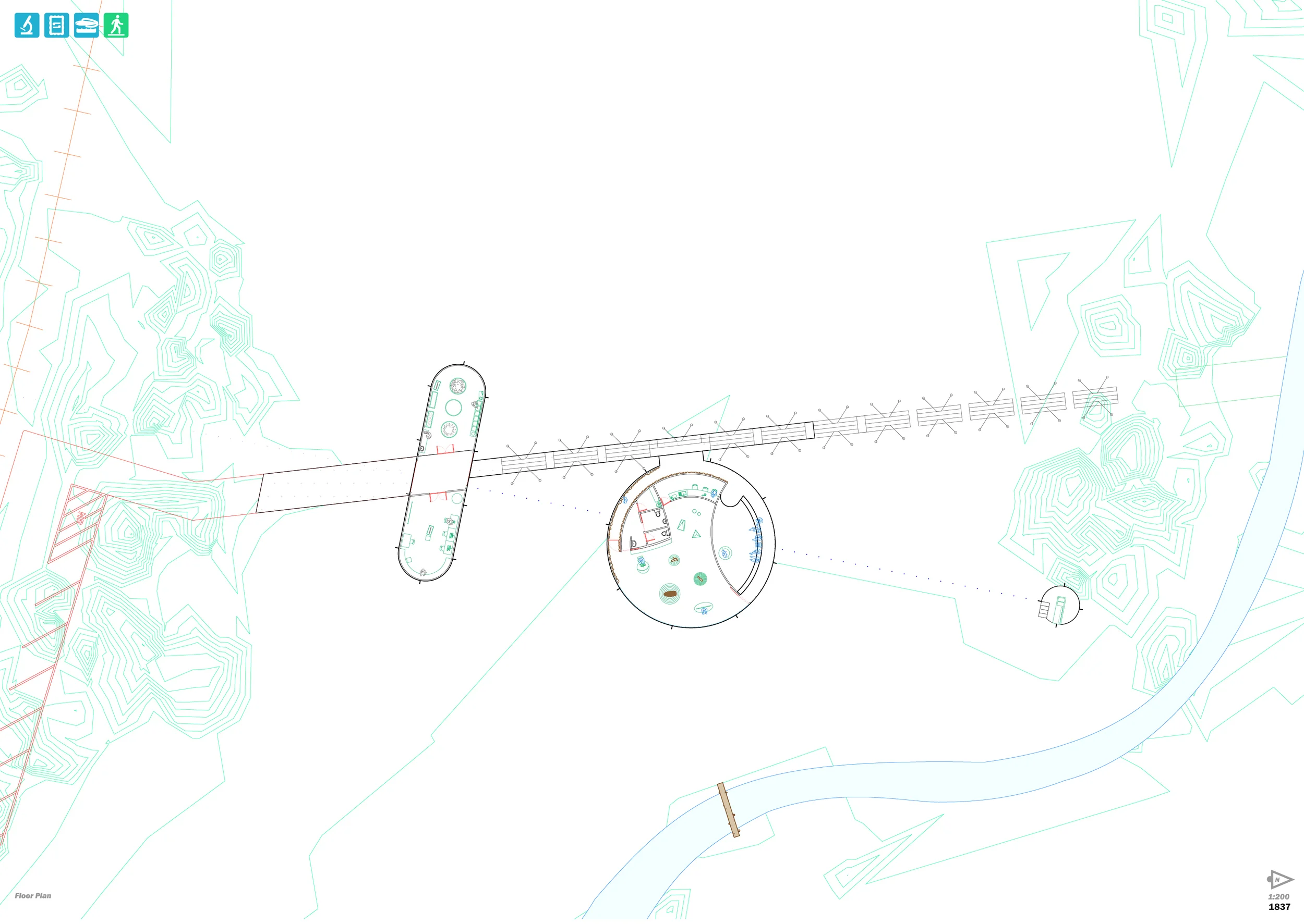 Meanwhile situated on the other axis are the more regimented structures designed to focus on the research and sustainability of eels. These elevated structures operate as workplaces for researchers and connect to one another via a boardwalk. There are three designated structures on this axis.